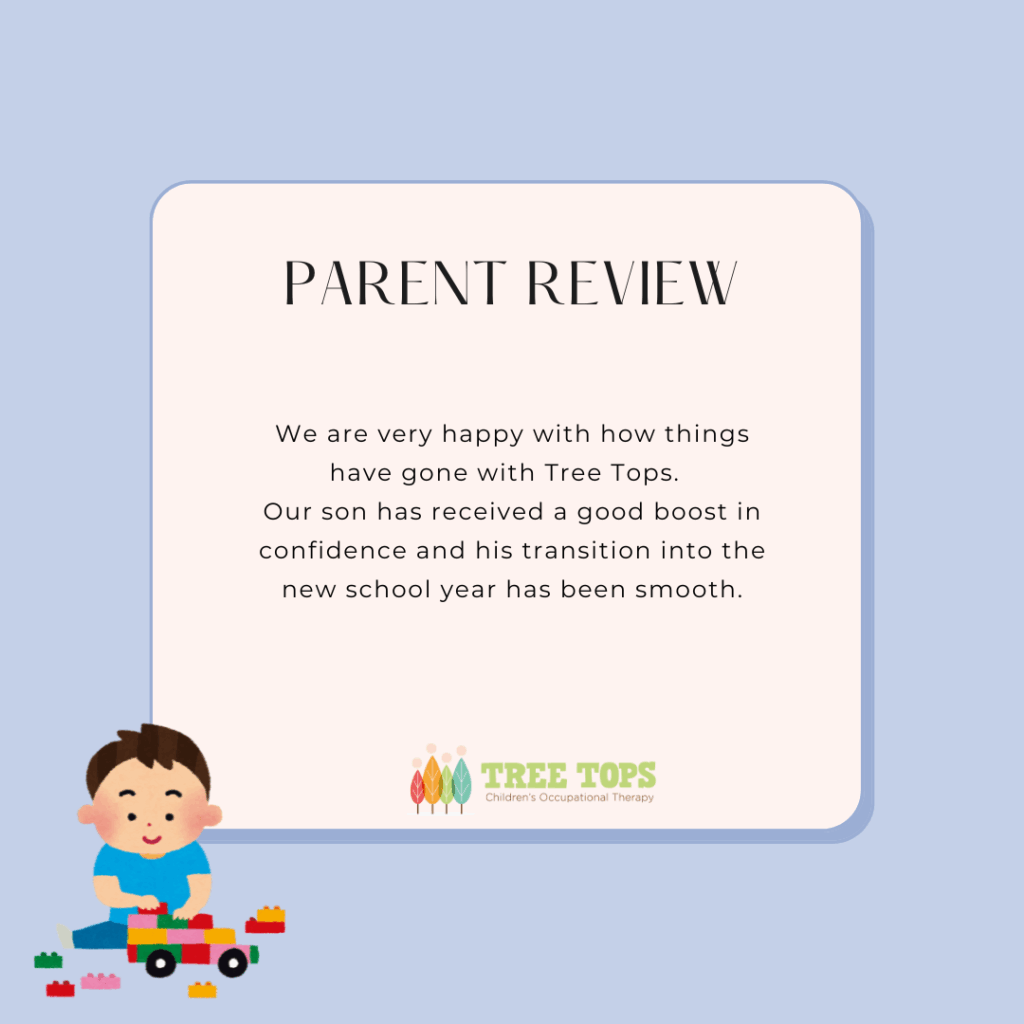 Keep up with the home programme and this will build your son’s confidence, continue to improve his fine and gross motor skills along with any sensory difficulties. Keep in touch.